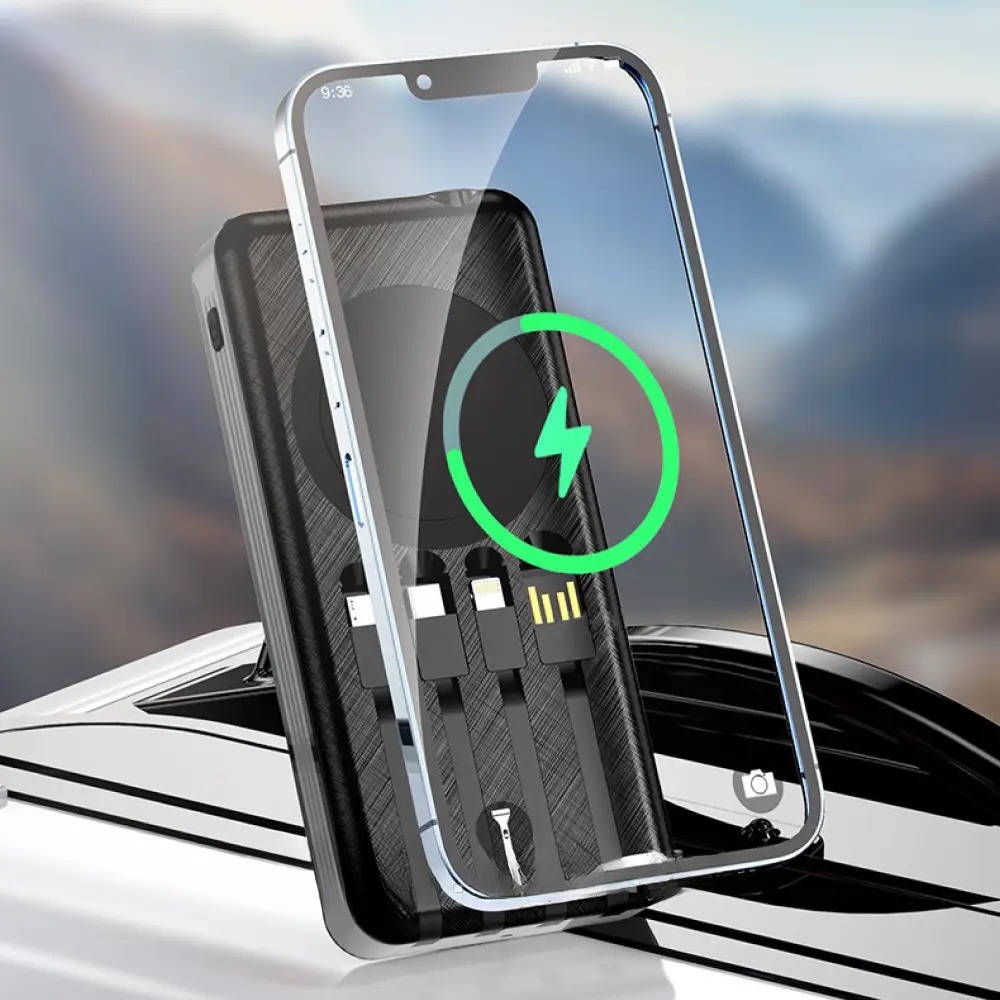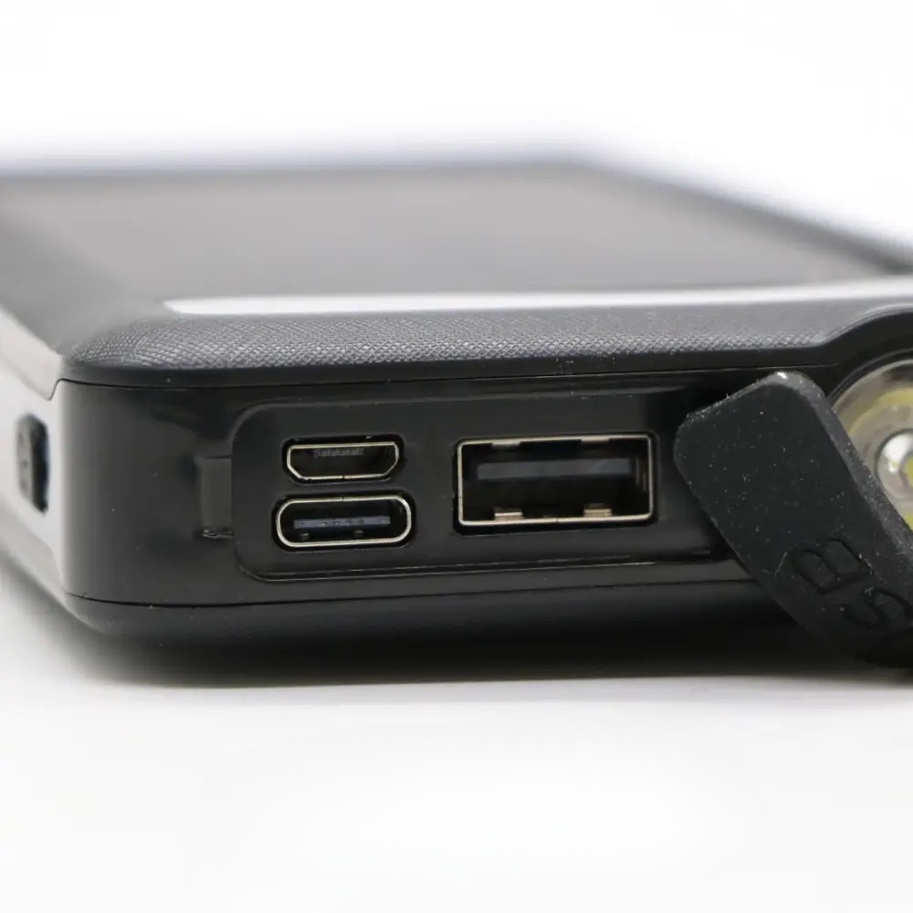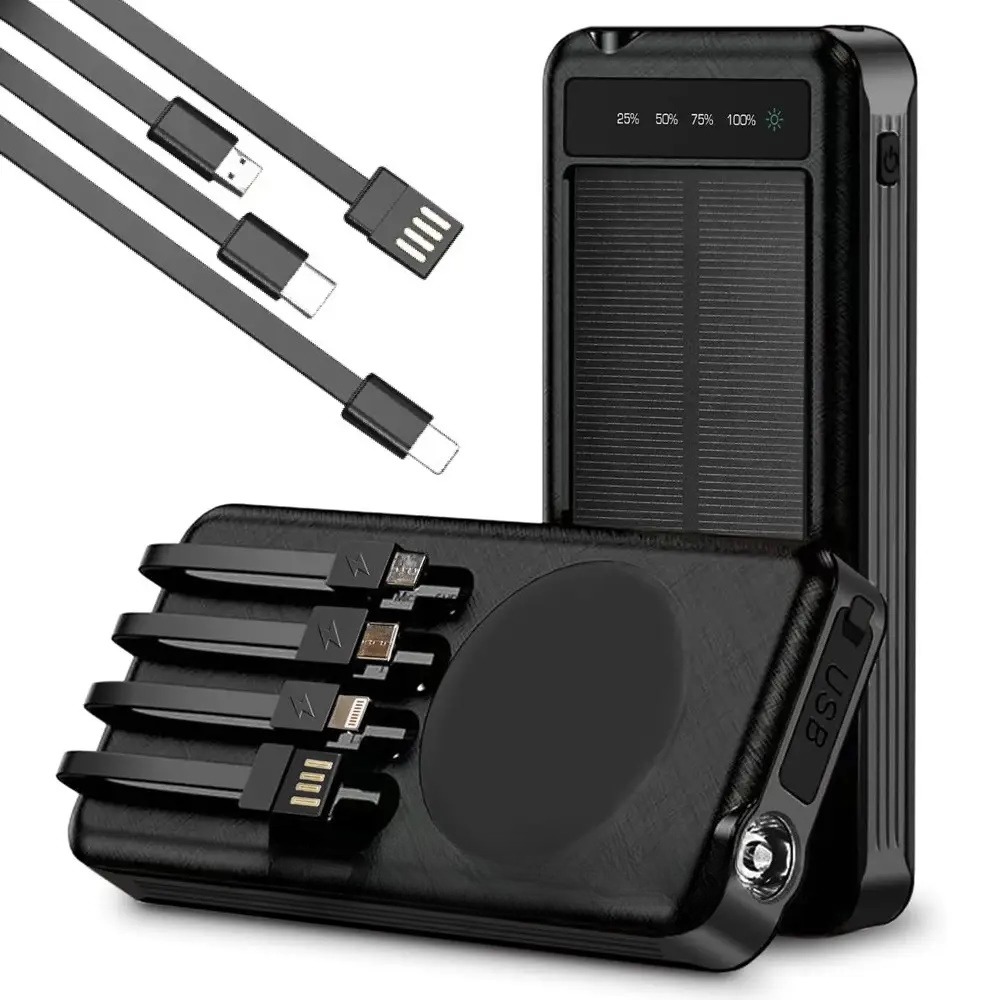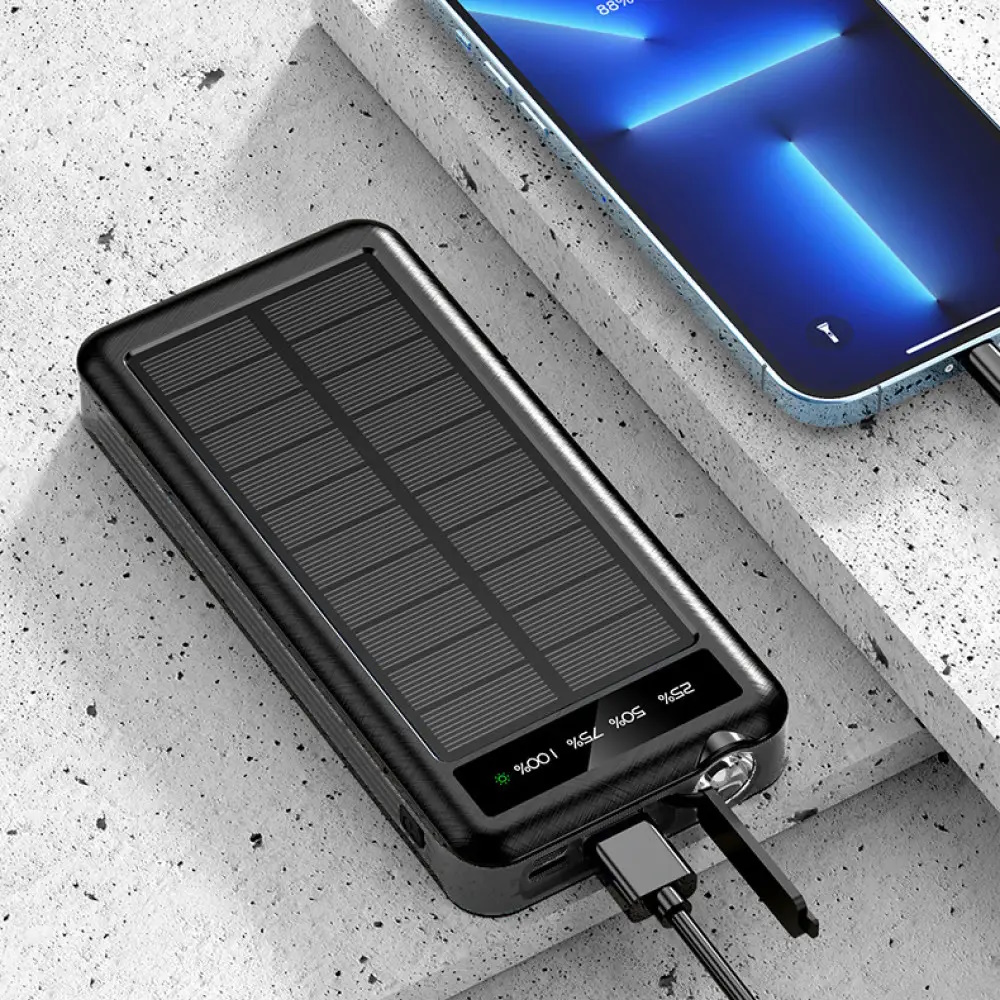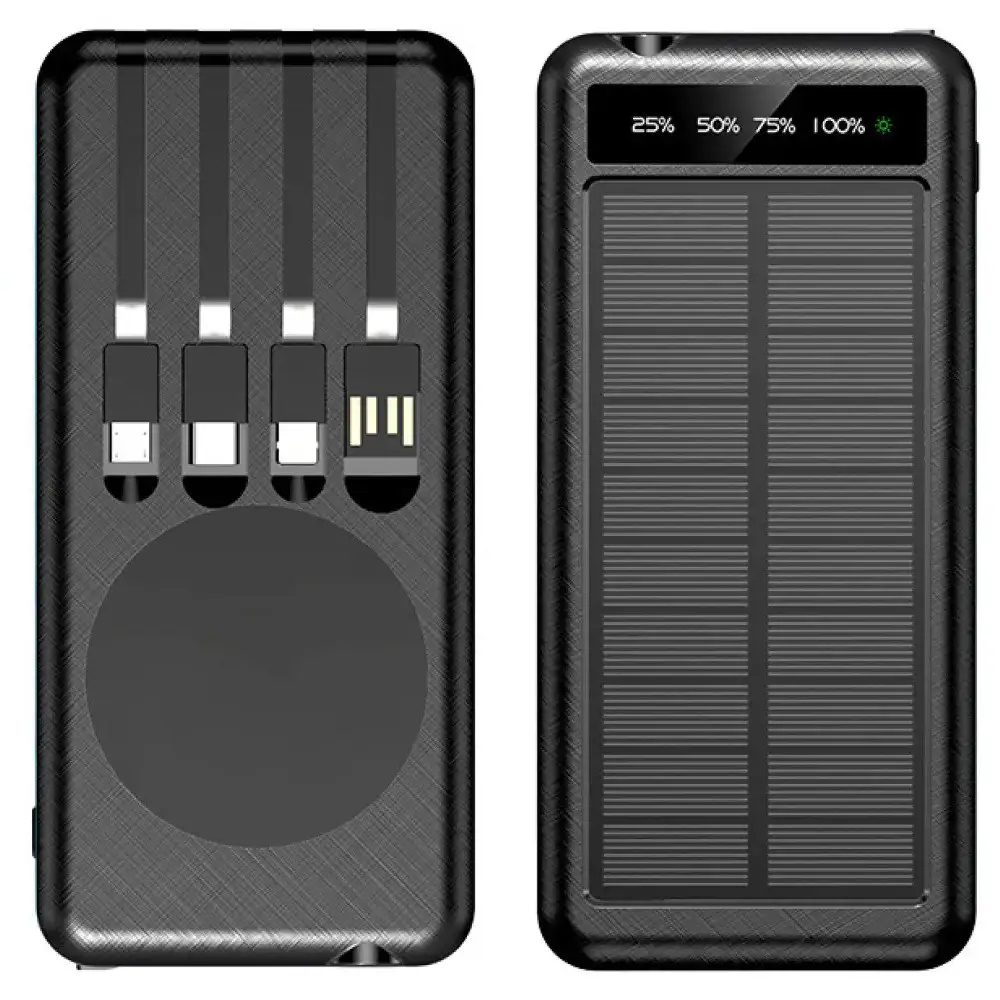 Особливістю цієї моделі є наявність сонячної панелі, яка дозволяє заряджати павербанк від сонячного світла. Це чудове рішення для мандрівників та любителів активного відпочинку, де доступ до електрики може бути обмежений. Вбудовані чотири кабелі та універсальні роз'єми USB, Type-C та micro USB забезпечують сумісність із безліччю пристроїв без необхідності носити додаткові дроти.